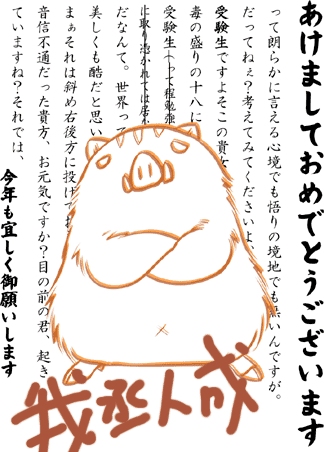 「年が明けるだけで目出度いか?そしてそれをミサの平和の挨拶の如くそっちこっちにおめでとうと言わなきゃいけないのか?しかもこの情報化社会ど真ん中で手紙?郵政公社の仕事が増えるだけだろ。」